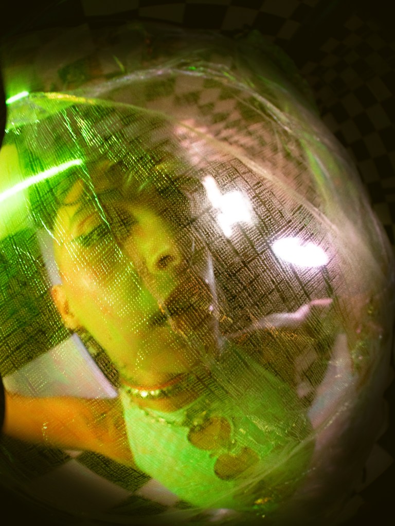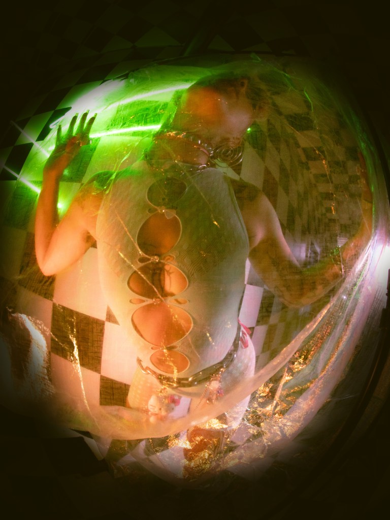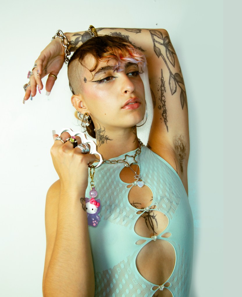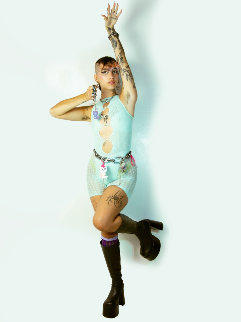 The idea of conceptualizing a “digital version” of myself as the guiding for this shoot with the ever talented Patricia (instagram @___rici_). I drew on cyber-punk, hyperpop-esc, futuristic, post-human realness by using industrial elements, over-accessorizing, neons, and fictional characters. Having lots of chains, charms, patterns, and sparkles! Imagining what a digital/Sim/playable character of myself would look like. I thought it would be a fun and aesthetically pleasing way of playing on AI’s current prevalence but applied to actual human form. I customized the waist chain myself 🙂