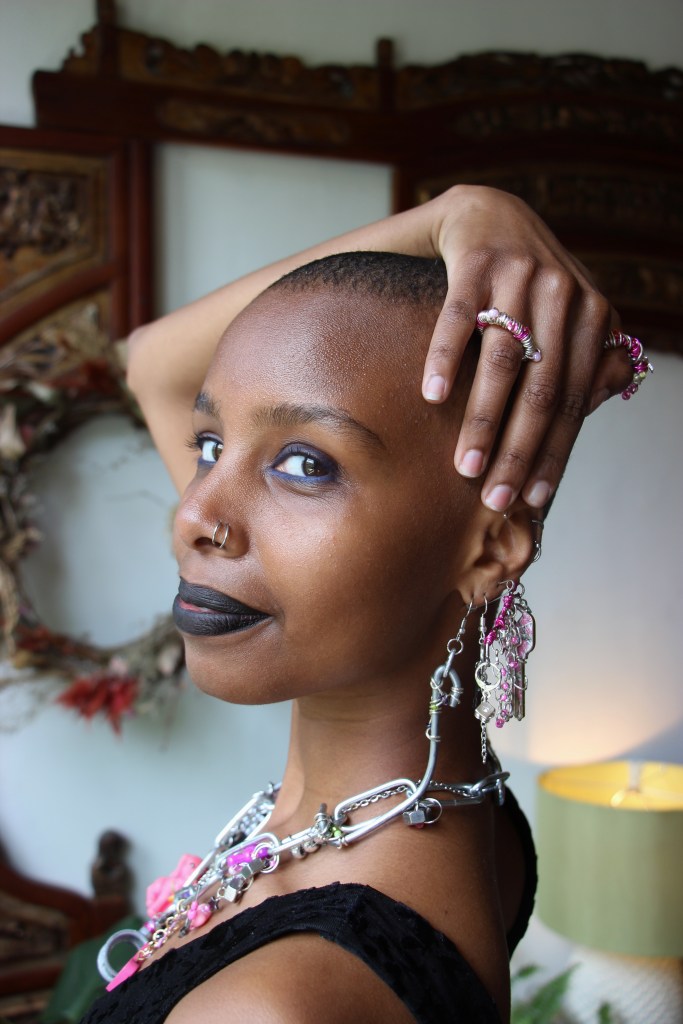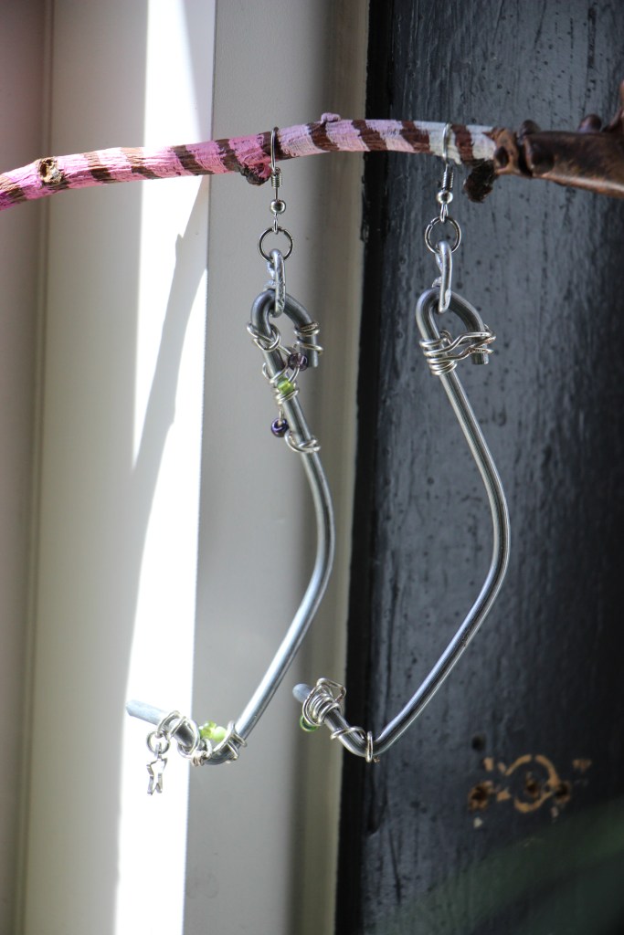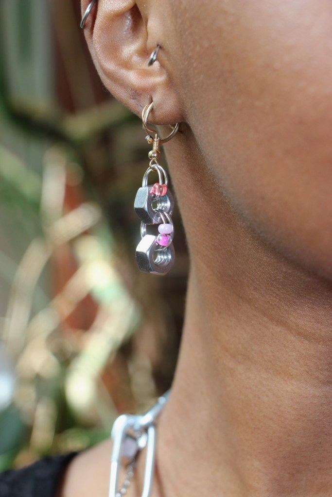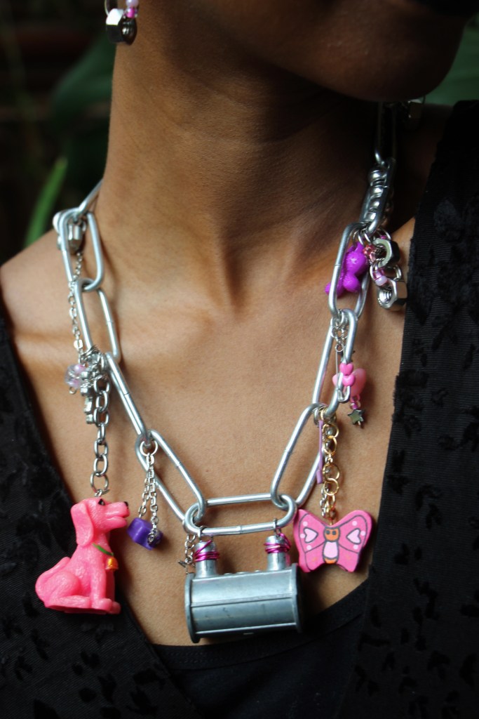 The materials used are silver aluminum wire; pink aluminum wire; pink, purple, and green beads; silver stars; wooden beads; and found item charms. The guiding themes for this first drop are fairycore, over-accessorization, childlike girliness, repurposed mechanical items, soft versus utility… all of these energies combine to create a collection indescribable in any words other than quintessential STEVIECORE! Released April 26, 2024 and modeled by Miski.