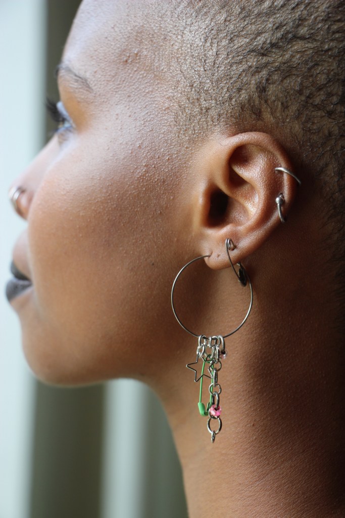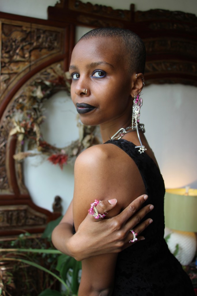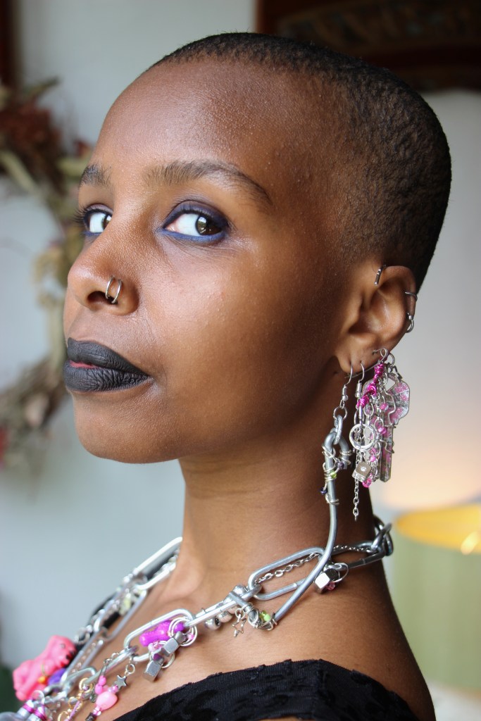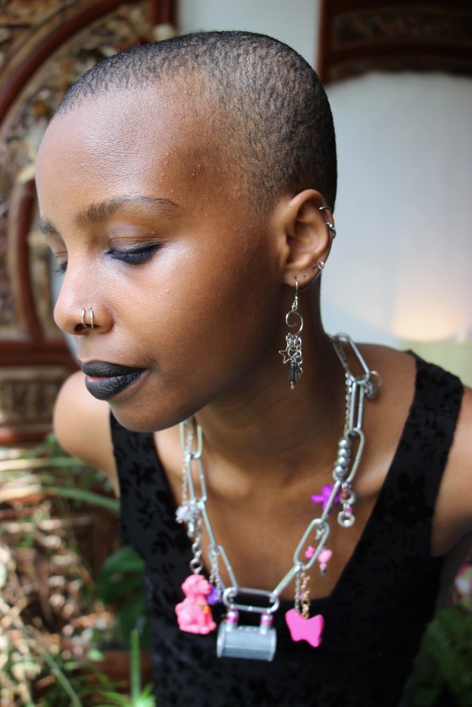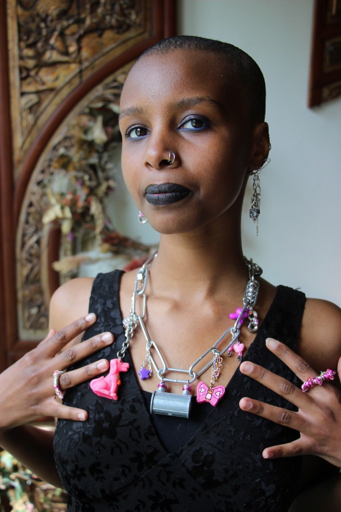 The materials used are silver aluminum wire; pink aluminum wire; pink, purple, and green beads; silver stars; wooden beads; and found item charms. The guiding themes for this first drop are fairycore, over-accessorization, childlike girliness, repurposed mechanical items, soft versus utility… all of these energies combine to create a collection indescribable in any words other than quintessential STEVIECORE! Released April 26, 2024 and modeled by Miski.