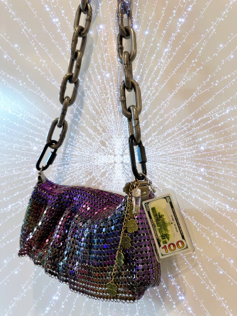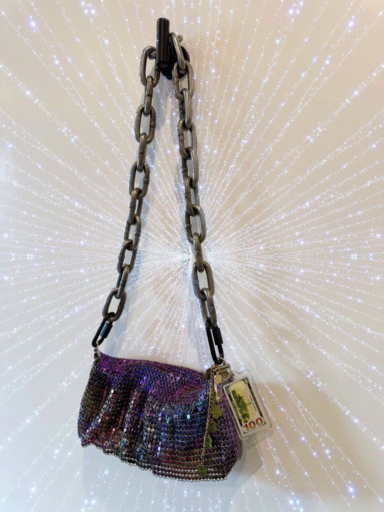 Incredibly excited to share my latest project: bags! I have been sitting on this project for some time, and now feels like the right time to introduce these creations to the world. For this first release, I have selected three FULLY customized purses: iridescent purple chainmail, replica 2000s LV faux leather, and black and pink leather “m.” All purses are found secondhand, carefully cleaned, fitted with a unique complimentary stainless steel chain, appropriate hardware, and adorned with a combination of charms either reclaimed or specially selected from my personal collection. Full description of each purse below