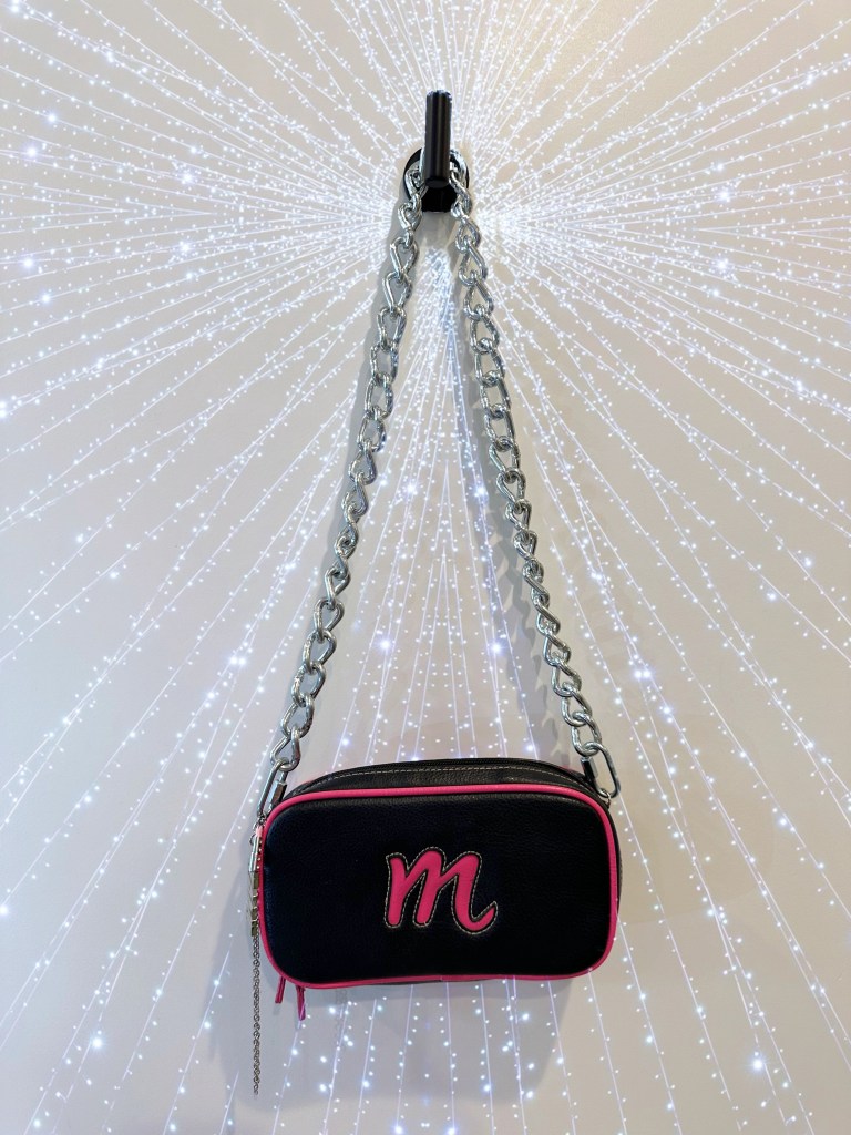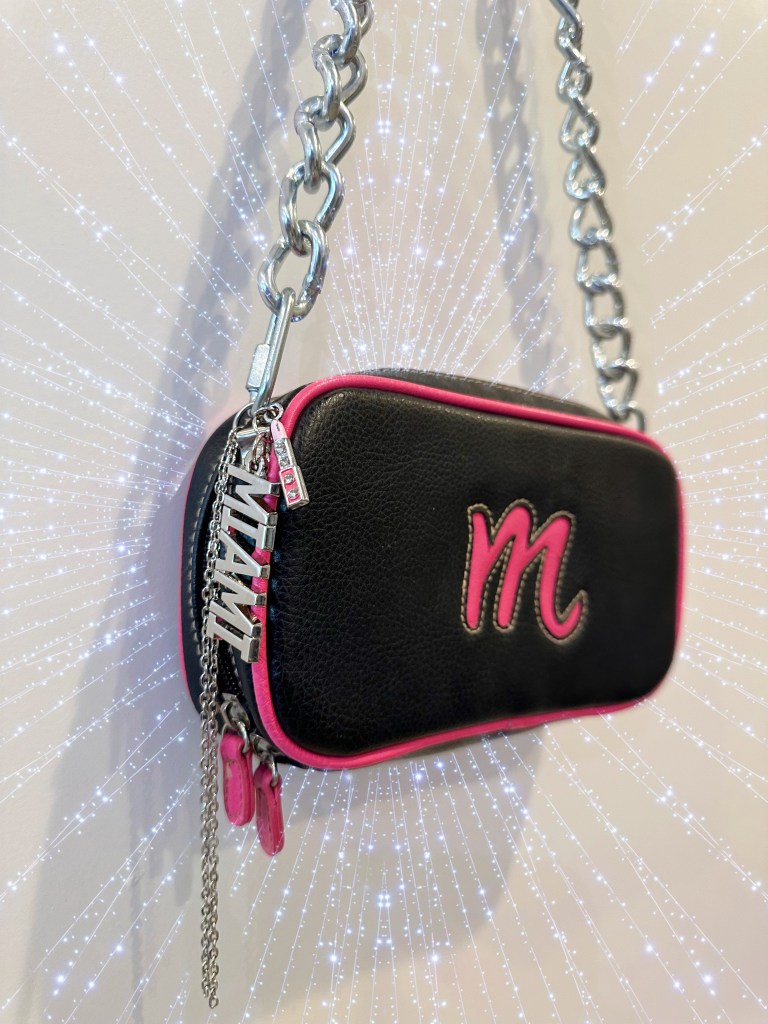 black and pink leather “m” with 2in zinc plated strap, charms: silver MIAMI piece, pink and gemmed lipstick, ~6in two-stranded dangle chain. Inside of bag contains detachable “m” coin purse.